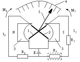 Это магнитоэлектрический прибор, у которого есть 2 рамки (1 и 2), которые механически жестко связаны между собой. Они установлены между полюсными наконечниками 3. На рамках крепится стрелка 5; 4 – шкала прибора. М1, М2 – вращающие моменты.