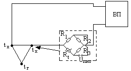 б) неуравновешенные мосты: ток не равен нулю, показание тока связано с показаниями термометра сопротивления I = (Rt); I ≠ 0