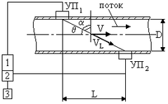 1 – время измерения по потоку; 2 – время измерения против потока (1< 2)