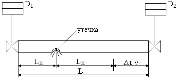 Основан на измерении разности давления от места утечки до двух датчиков D1 и D2, которые установлены на концах трубопровода.