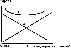 В каждый момент времени общество несёт затраты, складывающиеся из средств, затраченных на предотвращение загрязнения (и вызываемого им ущерба) и ликвидацию последствий от тех загрязнений, которых не удалось избежать. Чем больше средств вкладывается в природоохранную деятельность (кривая 2), тем меньше их понадобится для ликвидации ущерба от загрязнения окружающей среды (кривая 1), и наоборот. При этом общая сумма затрат будет наименьшей при таком уровне загрязнения (точка 4), при котором первые затраты равны вторым.