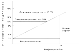 Согласно этому уравнению необходимая норма отдачи по конкретной акции состоит из двух элементов: доходности, лишенной риска, и премии за риск. Премия за риск равна произведению предполагаемой премии за риск для фондового рынка в целом и бета-коэффициента конкретной акции. Эта корректировка рыночного риска выполняется для того, чтобы получить оценку относительного риска, связанного с конкретной акцией.