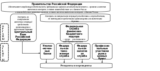 Согласно Указу Президента РФ от 9 марта 2004 г. № 314 «О системе и структуре федеральных органов исполнительной власти» из всех видов федеральных органов исполнительной власти функции по контролю в соответствующей сфере деятельности могут осуществлять только федеральные службы. Федеральным органом валютного контроля исполнительной власти, уполномоченным Правительством РФ, является Федеральная служба финансово-бюджетного надзора (Росфиннадзор), которая находится в ведении Министерства финансов РФ. Федеральная служба финансово-бюджетного надзора является федеральным органом исполнительной власти, осуществляющим функции по контролю и надзору в финансово-бюджетной сфере, а также валютный контроль за резидентами и нерезидентами, не являющимися кредитными организациями и валютными биржами.