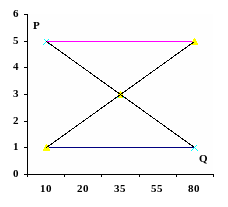Аналогичная картина наблюдается в случае превышения спроса над предложением: цена на товар растет, пока она не установится на уровне 3-х (т.е. происходит давление на цену снизу).