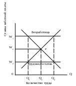 На рынке труда при уровне заработной платы, равном Wе, достигается равновесие - спрос на труд полностью удовлетворен, и все, кто готов работать при заработной плате, равной We, могут иметь работу. При повышении зарплаты W1 предложение труда Q2 превышает количество рабочих мест, которые могут предложить предприниматели. Возникает безработица. Рынок – трудоизбыточен. При заработной плате ниже равновесного уровня W2 желающих работать при такой заработной плате оказывается меньше, чем предлагаемое число рабочих мест. Рынок - трудонедостаточен. Обе эти ситуации в условиях совершенной конкуренции не могут быть устойчивыми. Они подвергаются коррекции со стороны рыночного механизма в направлении восстановления равновесия.