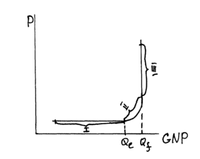 ривая совокупного предложения состоит из трех отрезков: кейнсианского /горизонтального/ - I, классического /вертикального/ - III и промежуточного - II