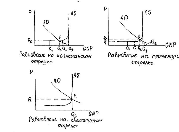 случае равновесия на кейнсианском отрезке уровень цен не влияет на изменение равновесия. Производство большего объема национального производства (Q2) не было бы обеспечено платежеспособным совокупным спросом, а производство в объеме (Q1) /меньше равновесного уровня/ будет стимулировать рост производства, так как в обществе существует неудовлетворенный спрос.