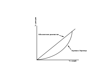 Так, кривая Лоренца показывает, сколько процентов от общих доходов населения страны фактически приходится на долю 20, 40, 60 и 80% семей. Особая наглядность масштабов неравенства достигается здесь через сравнение кривой (фактическое распределение) с биссектрисой угла осей координат, которая изображает теоретическую возможность абсолютно равного распределения доходов в обществе (т. е. когда 20% всех семей имели бы и 20% всех доходов, 40% семей - 40% доходов, 60% семей - 60% доходов и 80% семей - 80% доходов).