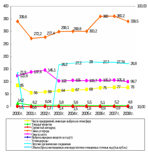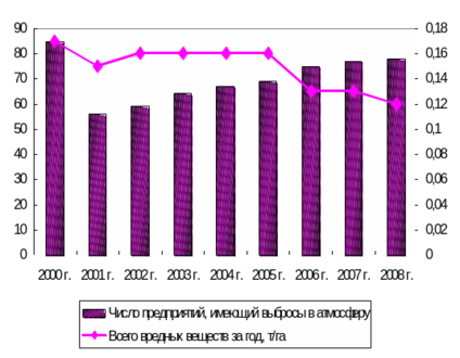 Важно отметить, что при увеличении количества предприятий в городе в 2001-2008 гг., показатели уровня выбросов вредных веществ за год сокращаются (рис. 5). Это свидетельствует о том, что мероприятия по сокращению выбросов загрязняющих веществ в атмосферу, разрабатываемые предприятиями и организациями, оказывают положительное влияние на экологическое состояние города.