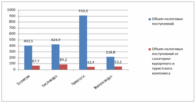 оля налоговых поступлений от санаторно-курортного и туристского комплекса в общем объеме налоговых доходов составляет 24,5%. Для сравнения в Кисловодске данный показатель равен 21%, в Ессентуках – 16,8%, Пятигорске – 4,8%. Таким образом, экономика города Железноводска в большей степени зависит от развития санаторно-курортного комплекса, который по праву можно считать градообразующим. Он обеспечивает занятость значительной части населения города – 18,1% всего населения. По удельному весу занятых в санаторно-курортном комплексе города Железноводск уступает лишь Кисловодску (22,1%), опережая город Ессентуки (17,2%) и город Пятигорск (4,1%).