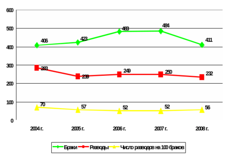 Наблюдается рост количества браков с 2004 г. по 2007 г. и значительное сокращение в 2008 г. на 15 %. Число разводов на 100 браков в 2008 г. сократилось по отношению к 2004 г. на 18 %. Такие же тенденции к сокращению числа разводов наблюдаются и на краевом уровне (на 12%).