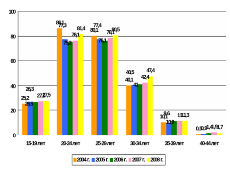 Средний возраст матери при рождении ребенка за последние пять лет возрос с 19,3 до 22,6 лет, что повлияло на рождаемость населения города. Если в предыдущие годы в возрасте матери 18-20 лет появлялся первый ребенок в семье, то сегодня - в 22,6 лет. Это подтверждают и показатели рождений детей в репродуктивном возрасте женщин (рис. 15).