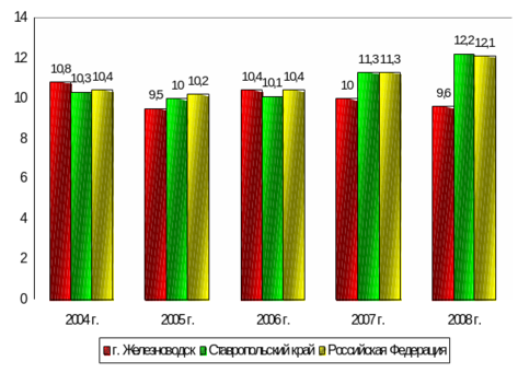 Коэффициент смертности населения города Железноводска выше краевого, но ниже российского показателей. Высокий уровень смертности населения города, возможно, указывает на низкий уровень медицинского обслуживания, неэффективность профилактических мероприятий в сфере охраны здоровья населения.