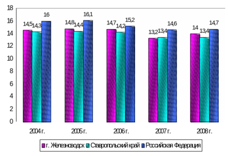 Рис. 16 показывает, что город Железноводск не отражает общероссийских и краевых тенденций увеличения рождаемости (к 2008 г. по отношению к 2004 г. рождаемость в Ставропольском крае увеличилась на 8% и в целом по РФ - на 7,1%), а напротив: рождаемость в городе за 2008 г. сократилась по сравнению с 2004 г. на 11,2%.