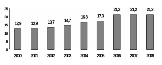 Рис. 14 Изменение суммарной емкости станций городской телефонной сети за 2000 - 2008 гг., тыс. номеров