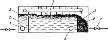 Схема действия самого флотоотстойника показана на рис. 8. Смесь сточной воды и воздуха поступает в приемную камеру 2 через распределительную трубу 1 и переливается через струегасящую перегородку 3 в отстойную часть флотоотстойника. Выделяющиеся из воды вследствие снижения давления пузырьки воздуха всплывают, увлекая за собой загрязнения и образуя на поверхности воды пену. Скребковый механизм 4 сгоняет пену через перегородку 5 в пенную камеру 6, из которой ее отводят вместе с загрязнениями по трубопроводу 7, осветленную воду - через перфорированную трубу 8.
