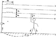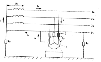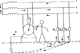 Рис. 6. Схема замыкания на корпус в сетях трехфазного тока с изолированной, нейтралью при заземленном электрооборудовании