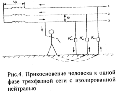 Это выражение показывает, что в сетях с изолированной нейтралью опасность для человека, прикоснувшегося к одному из фазных проводов в период нормальной работы сети, зависит от сопротивления изоляции проводов относительно земли: с увеличением сопротивления опасность уменьшается. При аварийном режиме, когда имеет место замыкания фазы на землю (Rиз = 0), человек оказывается под линейным напряжением сети и величина тока, протекающего через тело человека, может быть опасной.