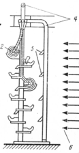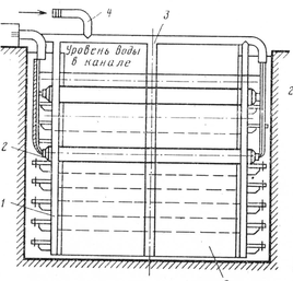 металлическая рама с кронштейнами; 2- блоки с бактерицидными лампами; 3- металлические пластины; 4- трубопровод напорной воды для промывки чехлов; 5- промывные сопла; 6- канал подачи обрабатываемой воды.