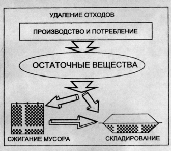 ефицит мощностей по ликвидации отходов в будущем приведет к тому, что выпуск продукции будет ограничиваться соответствующим отвальным хозяйством, а отходы рассматриваться как полезная часть выпускаемой продукции в виде сырья. Утилизация всех возможных материалов должна сопоставляться с вариантами устранения отходов. Таким образом, утилизация и устранение должны восприниматься как кругооборот материалов, создаваемый в значительной мере промышленным хозяйством (рис. 2)