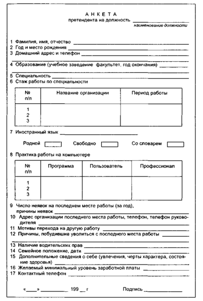 В ряде отечественных организаций разработаны специальные анкеты претендента на должность специалиста.