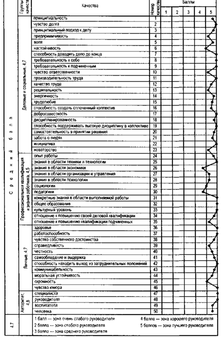 Пятая группа включает следующие качества: умение работать с подчиненными: умение работать с руководителями разных организаций; умение создавать сплоченный коллектив; умение подобрать, расставить и закрепить кадры.