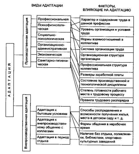 В условиях функционирования рынка труда возрастает роль вторичной адаптации. При этом необходимо внимательно изучать опыт зарубежных фирм, которые уделяют повышенное внимание первичной адаптации молодых работников. Данная категория персонала нуждается в особой работе со стороны администрации организаций. Чаще всего профессиональная адаптация рассматривается как процесс приобщения человека к труду в рамках определенной профессии, включения его в производственную деятельность, усвоения им условий и достижения нормативов эффективности труда. Однако адаптацию нельзя рассматривать только как овладение специальностью. Она предусматривает также приспособление новичка к социальным нормам поведения, действующим в коллективе, установление таких отношений сотрудничества работника и коллектива, которые в наибольшей мере обеспечивают эффективный труд, удовлетворение материально-бытовых и духовных потребностей обеих сторон. Виды адаптации приводятся на рис. 4.1.