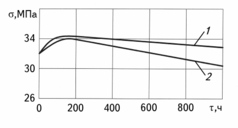 Наличие экстремума при выдержке в течение до 200 – 400 часов связывается с пластифицирующим действием воды, что приводит к увеличению гибкости и облегчению ориентации молекул при растяжении, а также к равномерному распределению напряжений в материале. К этому же эффекту приводит и просто нагревание.