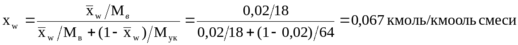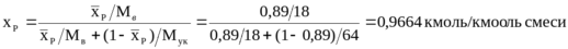 | 1.1.Материальный баланс колонны и рабочее флегмовое число. Содержание смеси: Температура исходной смеси tсм=37,0°С Температура кубового осадка после выхода его из холодильника tхол w=17,0°С Температура дистиллята после выхода его из холодильника tхол p=42,0°С Производительность F = 9,5·10-3кг/ч или 2,64 кг/с Производительность колонны по дистилляту Р кубовому остатку W определим из уравнений материального баланса колонны: Отсюда находим: Нагрузки ректификационной колонны по пару и жидкости определяются рабочим флегмовым числом R; его оптимальное значение Rопт можно найти путём технико-экономического расчета. Используют приближенные вычисления, основанные на определении коэффициента избытка флегмы (орошения) b=R/Rmin . Здесь Rmin- минимальное флегмовое число: где xF и xP- мольные доли легколетучего компонента соответственно в исходной смеси и дистилляте, кмоль/кмоль смеси; yF*- концентрация легколетучего компонента в паре, находящемся в равновесии с исходной смесью, кмоль/кмоль смеси. Один из возможных приближенных методов расчета R заключается в нахождении такого флегмового числа, которому соответствует минимальное произведение N´(R+1), пропорциональное объему ректификационной колонны (N - число ступеней изменения концентраций или теоретических тарелок, определяющее высоту колонны, а (R+1)- расход паров и, следовательно, сечение колонны) . Определим R . Пересчитаем составы фаз из массовых долей в мольные по соотношению где Mв и Мук - молекулярные массы соответственно воды и уксусной кислоты, кг/кмоль.