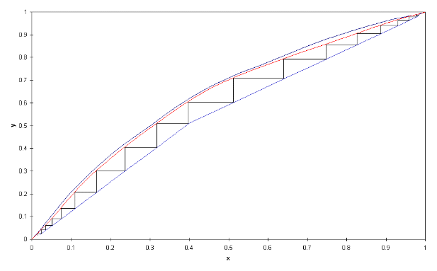 Исходя из этой формулы на диаграмме y - x строится кинетическая кривая, представляющая собой зависимость yк от x , а затем аналогично предыдущему методу графически выстраиваются ступени. Графическую иллюстрацию этого метода можно увидеть на рисунке 4.
