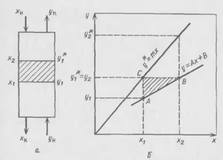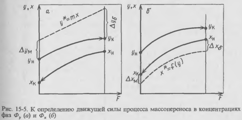 Как было указано ранее, движущая сила массообменных процессов определяется степенью отклонения от равновесия. Определяется разностью между рабочей и равновесной концентрациями или равновесной и рабочей, в зависимости от того, какие из них больше. При этом очевидно, что движущую силу можно выражать либо через концентрации распределяемого вещества в фазе G, т. е. через Δy, либо через концентрации его в фазе L, т. е. через Δx.