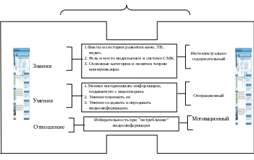 В диссертационном исследовании Л.А.Ивановой, также построенном на интегрированном медиаобразовании, связанном с базовыми курсами преподавания иностранного языка, была разработана следующая модель (рис.1, рис.2) развития медиакомпетентности аудитории на занятиях по иностранному языку (правда, в самом тексте медиакомпетентность была названа не слишком удачным, на наш взгляд, термином медиакоммуникативная образованность) [Иванова, 1999, с.12].