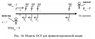 Цена источника капитала компании «привилегированная акция» (Rпа) определяется по тем же принципам, что и Rко. На рис. 34 изображена графическая модель DCF – денежных потоков, порождаемых привилегированной акцией, как для инвестора, так и для эмитента. Аналогично рисунку 33, здесь тоже изображена условная ось времени, слева от нее – фигура инвестора, справа – фигура эмитента. Ниже оси стрелками показаны элементы денежного потока, направленного к инвестору – фиксированные дивиденды (Дф), число которых уходит в бесконечность (∞). Выше оси – денежный поток, исходящий от эмитента. Он состоит из ФИ – финансовых издержек, связанных с обслуживанием данного инструмента. По своей величине элементы того и другого потоков равны как друг другу, так и между собой (Дф = ФИ). Оба денежных потока – бессрочные аннуитеты.