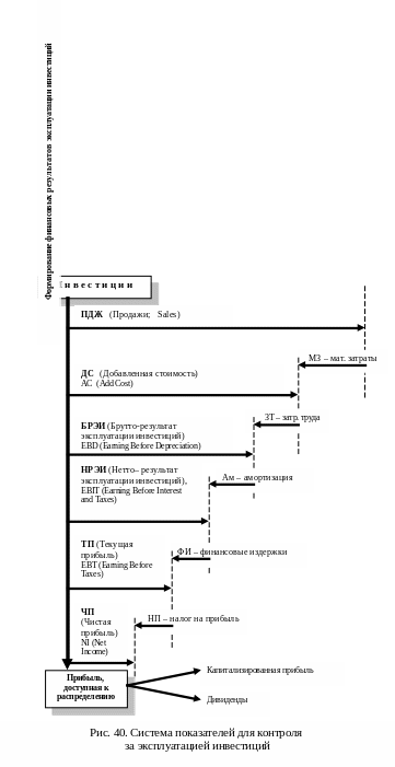 На рис. 40 условно изображен «процесс эксплуатации инвестиций» в виде вертикальной стрелки (от «инвестиций» до «прибыли, доступной к распределению»). Стрелками, направленными слева направо, обозначено «поступление» денег в компанию; стрелками, направленными справа налево, обозначен «отток» денег из компании. Соответственно, «процесс эксплуатации инвестиций» имеет шесть стадий, на которых осуществляется контроль за его эффективностью с помощью шести показателей – ПДЖ, ДС, БРЭИ, НРЭИ, ТП, ЧП, определяемых последовательно друг за другом. Система данных показателей построена по принципу «матрешки»: они, как бы, вложены друг в друга.