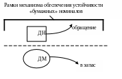 В этой ситуации деньги уже не могут быть «всеобщим эквивалентом» материальных ценностей (товаров). Знак (любого типа) сам по себе не может быть в принципе ни чьим эквивалентом. Это – измеряющая и регулирующая активность людей сущность. Но, становясь особой знаковой сущностью, деньги требуют создания специальной финансовой системы – постоянно работающего механизма, удерживающего денежные номиналы от обесценения. Без этого такие «неполноценные» (в сравнении с металлическими) деньги не могут выполнять главную функцию денежного знака – функцию меры стоимости материальных благ (см. рис. 4). На этом рисунке показано, что эмиссия «бумажных» денег приводит: во-первых, к разделению денежного номинала (ДН) и денежного материала (ДМ), во-вторых, денежные номиналы на бумажных носителях могут обращаться только в рамках специально создаваемого в стране финансового механизма обеспечения их устойчивости.
