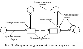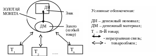 Как известно, по Марксу, деньги – это всеобщий эквивалент, особый товар (в последний исторический период их существования – в основном золото), выделившийся из массы других товаров и приобретший особые функции денег – меры стоимости, средства обращения и др. Однако общеизвестно, что К. Маркс в 1-м томе «Капитала» [11] писал про устройство и функции вовсе не тех денег, которые существовали в ХIХ в. (когда он жил и работал). Он описывал эпоху зарождения капиталистического способа производства, т.е. позднее средневековье. Деньги в ту эпоху были металлическими (в основном золотыми), устроенными по принципу «монеты» (см. рис. 3).