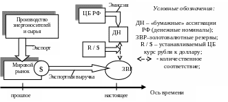 На рис. 6 показано, что ЦБ РФ в качестве принципа своей работы в области денежной эмиссии принял постулат: рублевая масса, выпущенная в обращение, должна быть обеспечена долларовой массой золотовалютных резервов ЦБ РФ (ЗВР), пересчитанной по текущему курсу рубля к доллару США (R/$), который сам же ЦБ РФ и устанавливает.