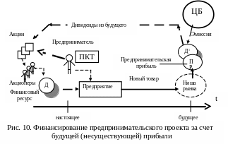 В данной ситуации, как известно, практика придумала следующий ход. Чтобы получить финансовые ресурсы в свое распоряжение, предприниматель выпускает акции (облигации и т.п.) своего будущего предприятия. Другими словами, он выпускает номиналы (например, акций на 1 млн. долларов), не имеющие сегодняшнего материального обеспечения (ведь ни предприятия, ни товаров еще нет). Но эти инструменты являются финансовыми обязательствами перед акционерами на получение ими доли той будущей прибыли, которая возникнет, если его проект будет реализован. Он продает их желающим стать компаньонами предпринимателя, а вырученные деньги инвестирует в проект (ПКТ) (см. рис. 10).