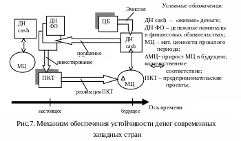 На рис. 7 тоже изображена условная ось времени, однако все процессы здесь разворачиваются между «настоящим» и «будущим» моментами (периодами) времени. Данный механизм строится на представлениях о современном предпринимательстве инновационного типа, классическое описание которого было дано еще в 1911 году Й. Шумпетером (см. [8]). На рис. 7 показано, что в любой настоящий момент времени вся «бумажная» масса денежных номиналов, находящихся в обращении, делится на два типа:
