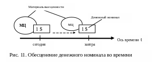 В основания финансовой математики положено представление о том, что материальная стоимость, стоящая за любым денежным номиналом, не остается неизменной во времени. Если не осуществлять никаких инвестиций, увеличивающих материальные ценности в экономике, то денежный номинал (например, 1 доллар) будет со временем обесцениваться, поскольку стоящие за ним материальные ценности будут «проедаться» (см. рис. 11).