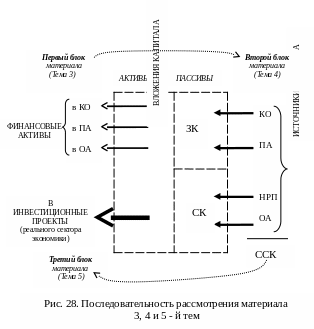 На рисунке 28 также помечены три блока материала: первый блок – материал темы 3 (в ней будут рассмотрены вопросы, связанные с вложениями в финансовые активы трех видов – КО, ПА и ОА разных компаний, обращающиеся на рынке);