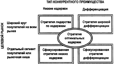 4. Сфокусированная стратегия, или стратегия рыночной ни­ши, основанная на низких издержках, ориентирована на уз­кий сегмент покупателей, где фирма опережает своих конкурентов за счет более низких издержек производства.