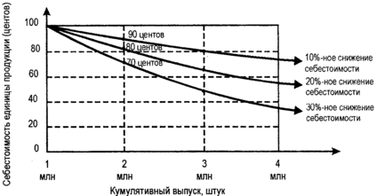 Рис. 3.2. Сравнение воздействия на себестоимость единицы продукции эффекта кривой опыта, равного 10%, 20%, 30%, при удвоении кумулятивного выпуска продукции