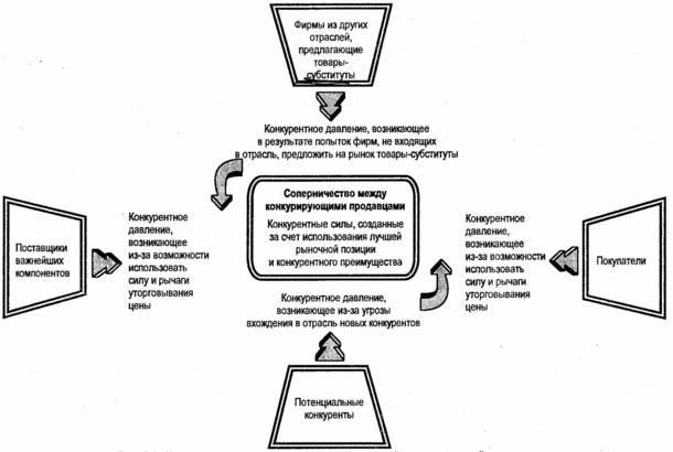 Даже несмотря на то, что влияние конкуренции в каждой отрасли различно, сам по себе характер конкуренции сходен, что позволяет использовать данную ниже схему для определения ее природы и степени воздействия конкурентных сил. Профессор Гарвардской школы бизнеса М. Портер наглядно доказал, что состояние конкуренции в отрасли можно охарактеризовать пятью конкурентными силами: