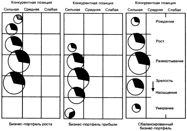 Сбалансированный портфель характеризуется равномерным распределением формирующихся «победителей» и «победителей» на стадии зрелости. В этом случае корпорация готовится к будущему, инвестируя в новых «победителей» и одновременно используя стабильных «победителей» для поддержки формирующихся.