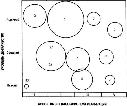 -третьих, переменные, используемые в качестве осей, не должны быть ни количественными, ни непрерывными величинами. Они могут быть дискретными переменными или определяться как строго очерченные классы или комбинации.В-четвертых, использование на карте окружностей различного диаметра (диаметр соответствует общему объему продаж фирм, сгруппированных в стратегические группы) позволяет наглядно отразить относительные размеры каждой стратегической группы.