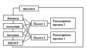 5. Матричная структура построена по принципу одновременного управления, как по горизонтали, так и по вертикали. Основу образует линейно-функциональная структура, которая дополняется структурами программного управления. Помимо руководителя организации назначается руководитель программы, ранг которого выше ранга руководителя организации.
