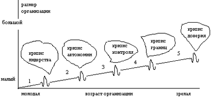 Л.Грейнер выделяет 5 циклов организационного развития, отделяемых друг от друга моментами организационных кризисов: кризис лидерства, кризис автономии, кризис контроля, кризис границ, кризис доверия. Кризис характеризуется снижением эффективности деятельности ниже границ рентабельности, потерей места на рынке, и возможностью гибели организации.