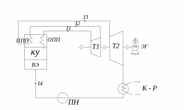 КУ - котельная установка с водяным экономайзером ВЭ; ПП – основной пароперегреватель; ППП - промежуточный пароперегреватель; Т1 - первая ступень турбины; Т2 - вторая ступень турбины; К-р- конденсатор; ЭГ - генератор электроэнергии; ПН - питательный насос; I1 - I4- энтальпия перегретого пара и питательной воды.