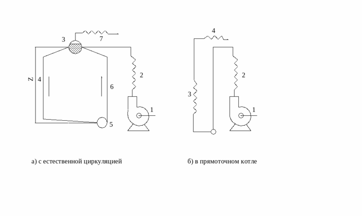 Питательная вода по трубопроводу 1 поступает в насос, который подает ее в водяной экономайзер 2 и далее в барабан 3. По необогреваемым спускным трубам 4 вода поступает в коллектор 5, из него в обогреваемые подъемные трубы 6. В этих трубах вода кипит, поэтому рабочее тело в них представляетс собой смесь насыщенного пара и воды (пароводяную смесь) с небольшой степенью сухости. Степень сухости определяет количество пара с 1 кг пароводяной смеси.